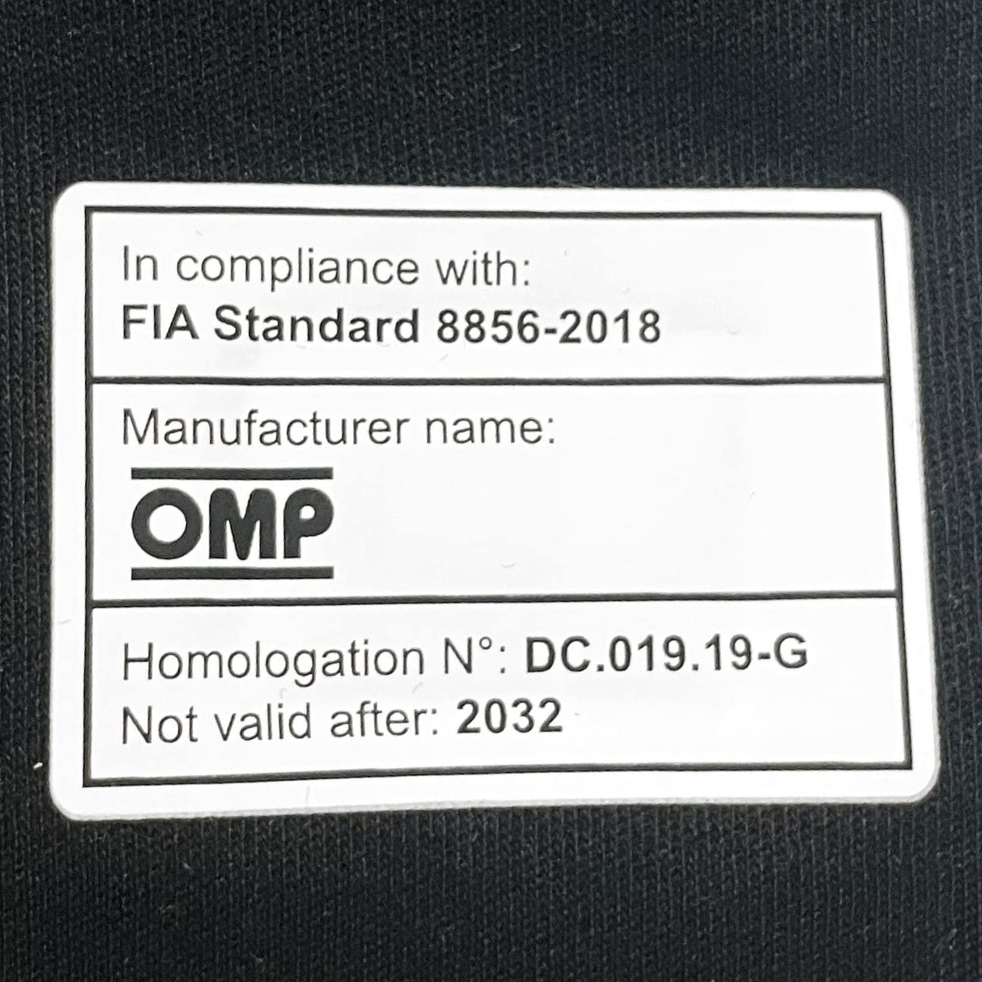 - Les gants concernées par la norme FIA 8856-2018 porteront des étiquettes indiquant le numéro de la norme FIA, le nom du fabriquant, le numéro de l’homologation et la date de fin de validité du produit, comme dans l’exemple suivant :